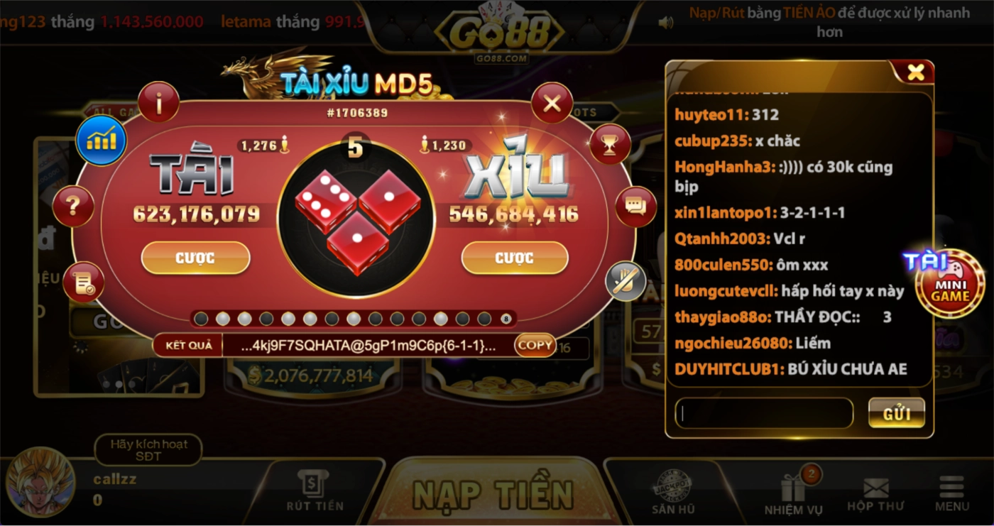 Go88 cũng là một cái tên không thể bỏ qua khi nhắc đến cổng game tài xỉu free. Nơi đây nổi bật với nhiều chế độ chơi đa dạng, từ tài xỉu MD5 cho đến Tài xỉu Livestream. Giao diện thân thiện cùng tốc độ tải game nhanh chóng sẽ giúp anh em trải nghiệm không bị gián đoạn. Thêm vào đó, Go88 thường xuyên tổ chức các sự kiện, mini game thú vị, nơi anh em có thể nhận thêm nhiều phần quà hấp dẫn khi tham gia.